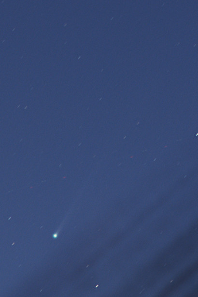 Hier der Versuch den Kometen mit einer einfachen Kamera und einem 200mm/4 Teleobjektiv am blauen Himmel nachzuweisen.